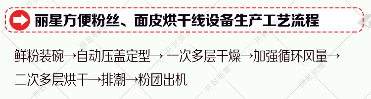 工艺流程:鲜粉装碗→自动压碗定型→⼀次多层干燥→加强循环⻛量→二次多层烘干→排潮→粉团出机